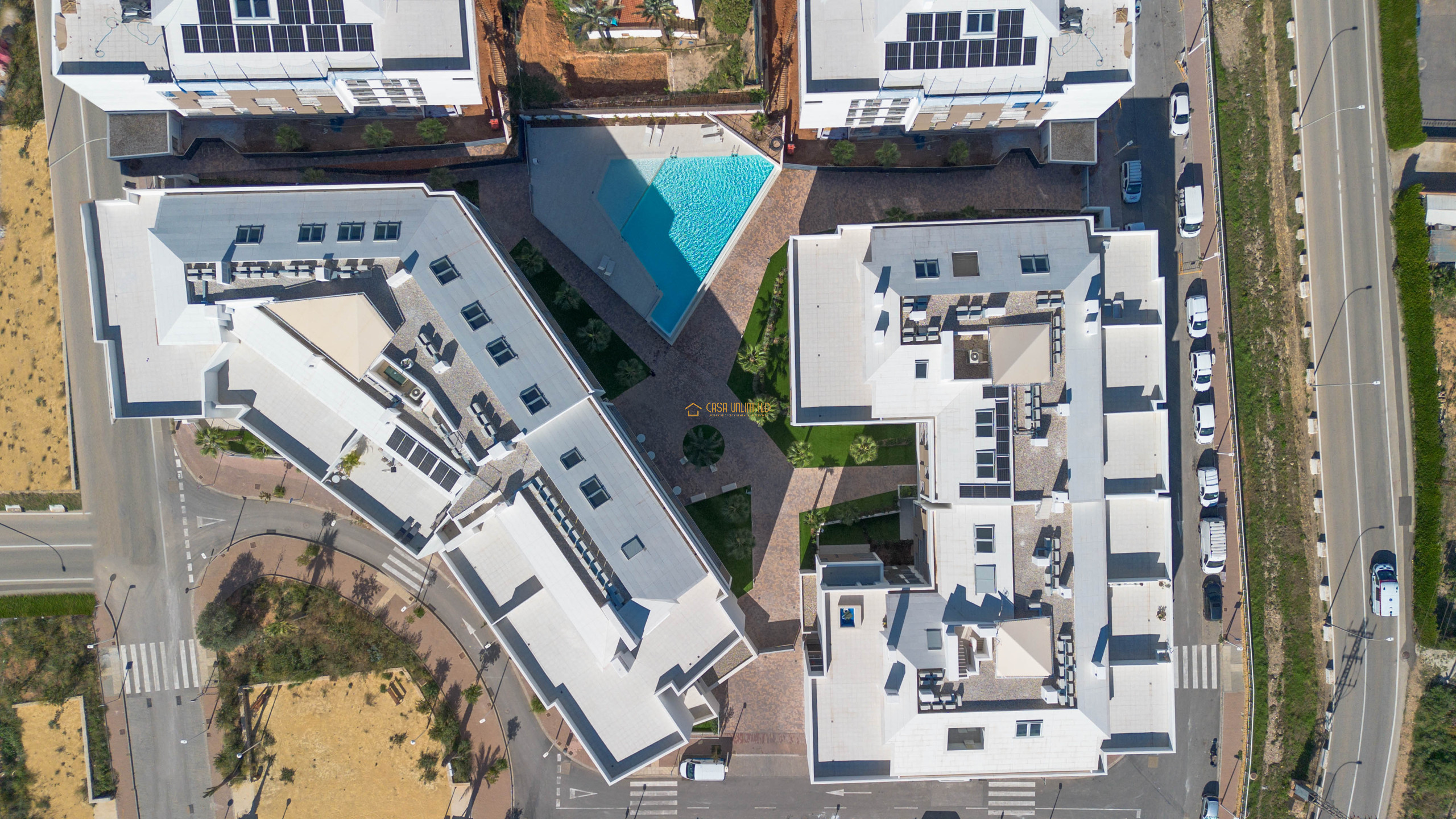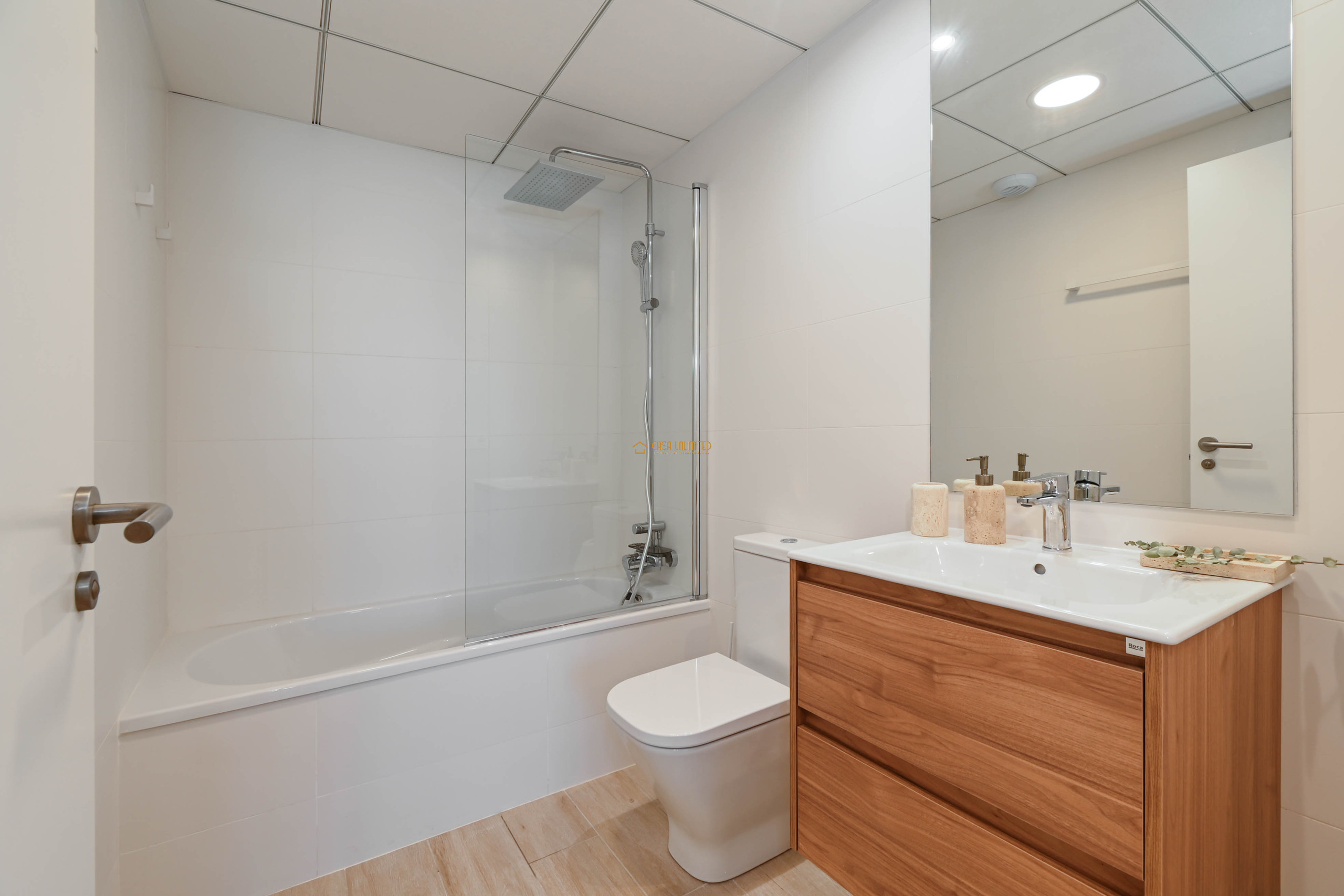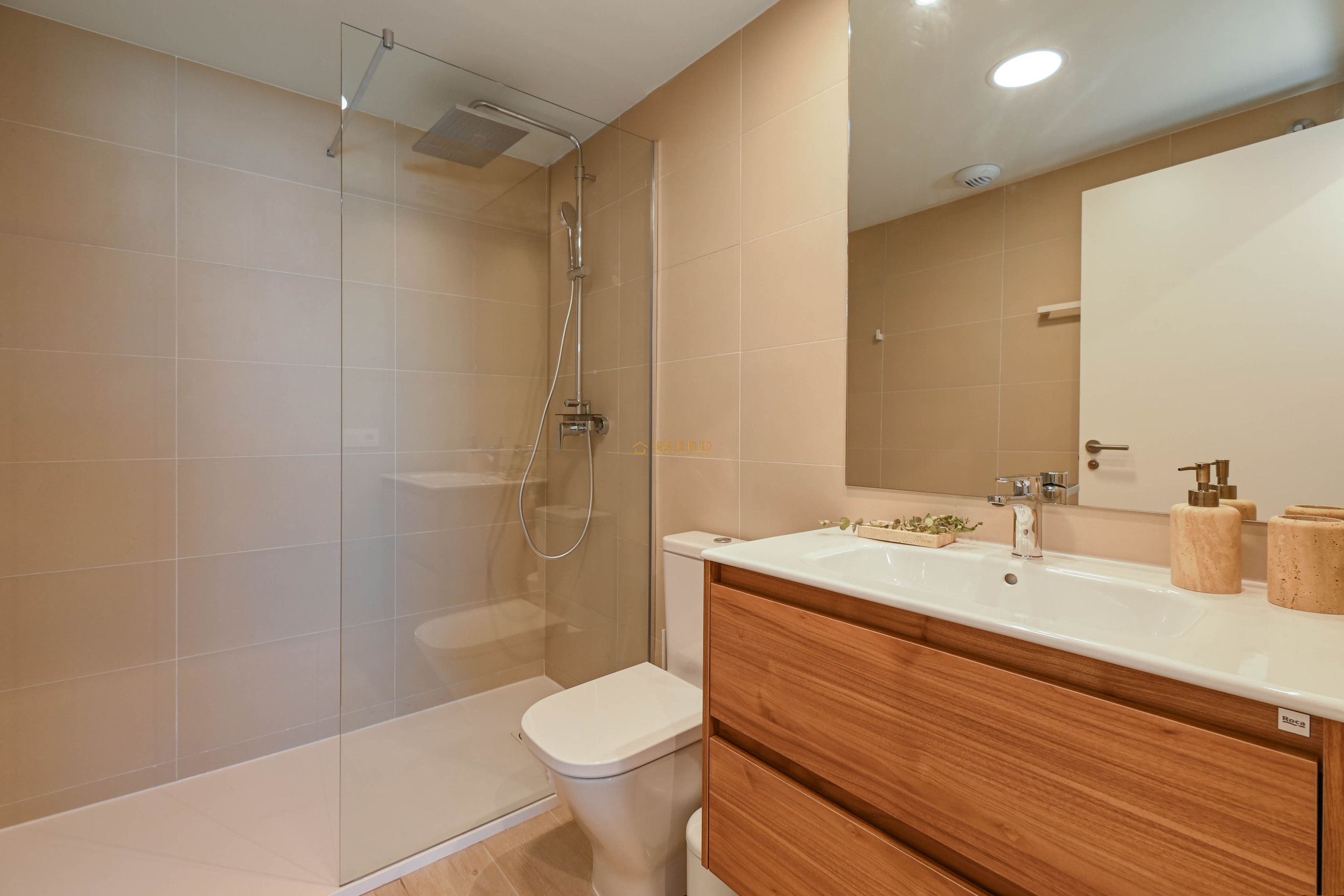 Het appartement beschikt over twee comfortabele slaapkamers en twee moderne badkamers — één met regendouche en één met ligbad. Daarnaast is er een ondergrondse parkeergarage en een prachtig gemeenschappelijk zwembad met zonnig terras.
