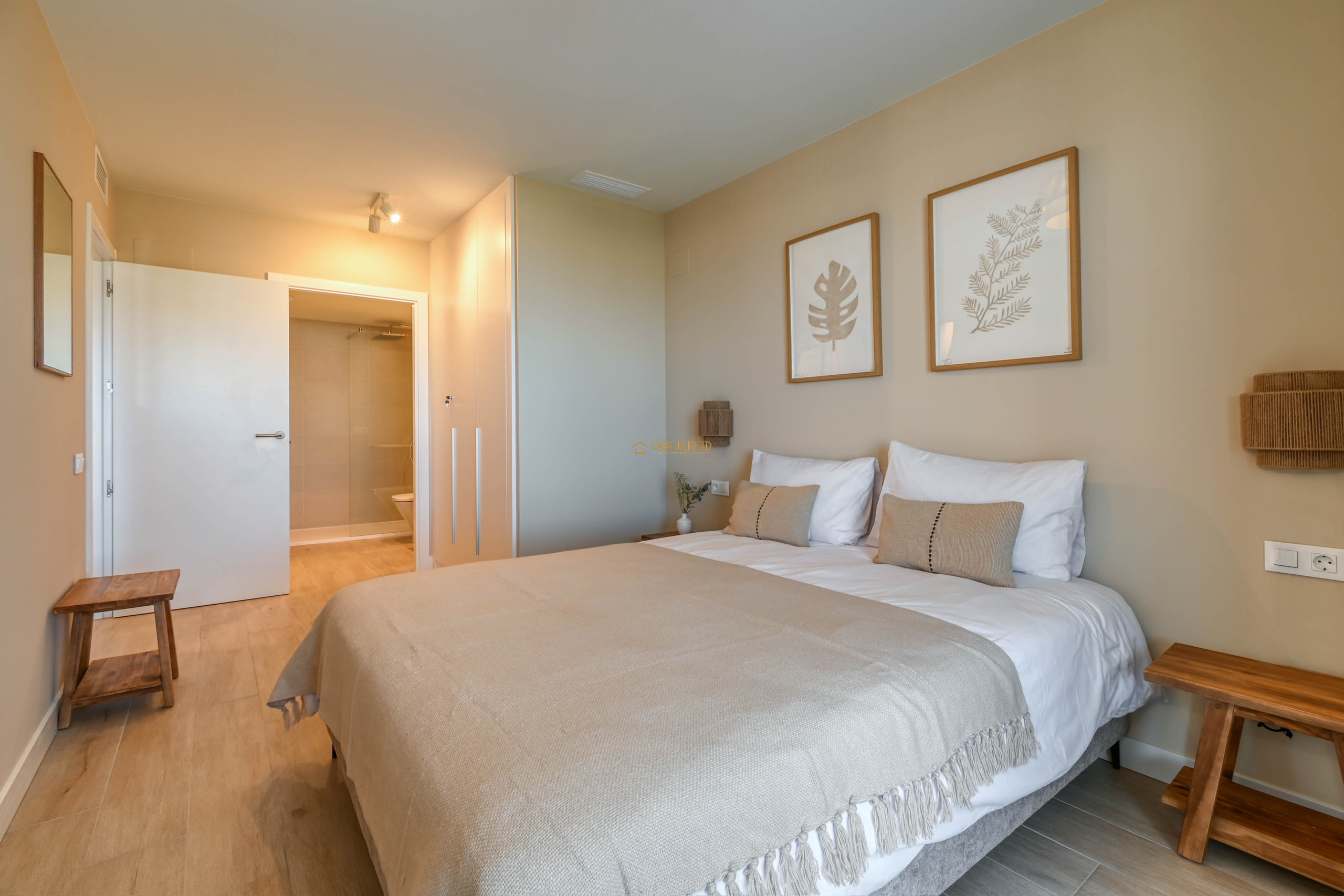 A modern and inviting apartment featuring a bright living area, elegant open kitchen and access to a spacious balcony with seating. Soft tones and natural materials create a serene, luxurious atmosphere.